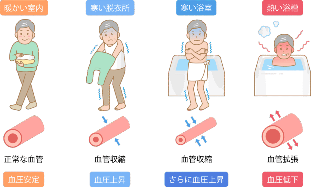 特に冬場の「脱衣所 → 浴室 → 湯船」のように、短時間で寒暖差が大きくなる場面で起こりやすく、失神や転倒、さらには心臓・血管への負担が高まると言われています。
