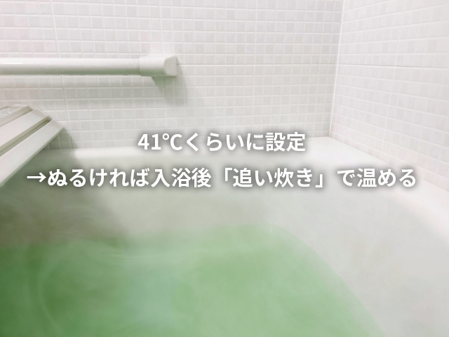 - 「ぬるい」と感じたら、追い焚きや足し湯で“入ってから”温度を微調整→ 最初から熱いお湯にしない