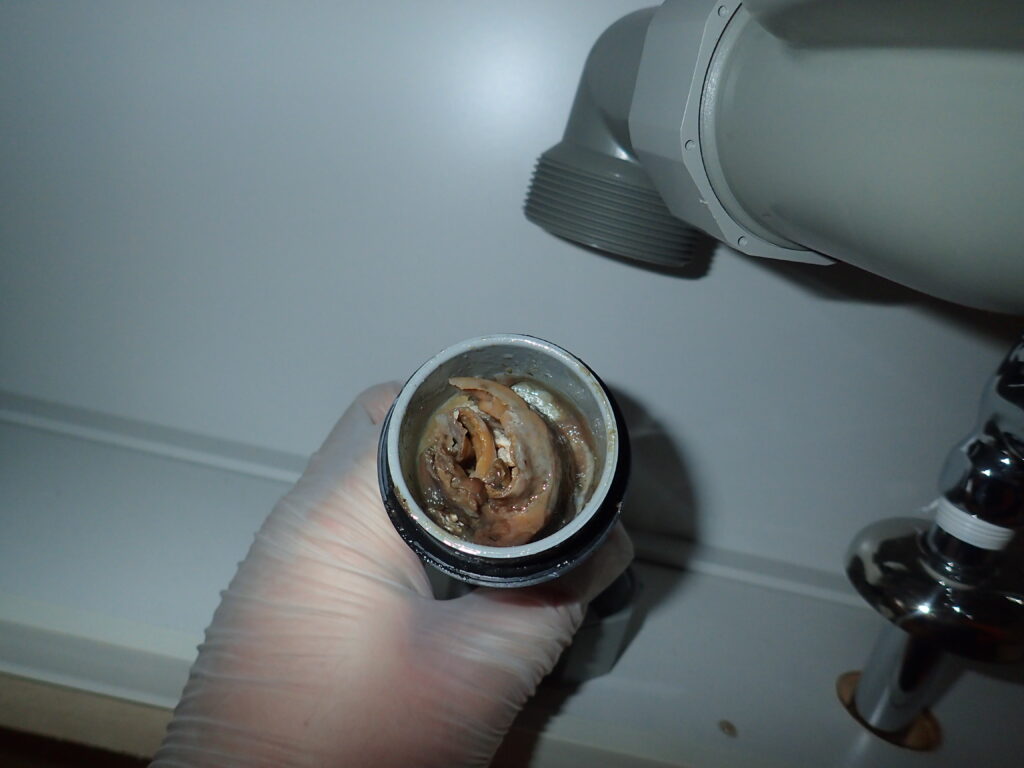 キッチンシンク下の排管を外してみると油汚れが固まっていました。