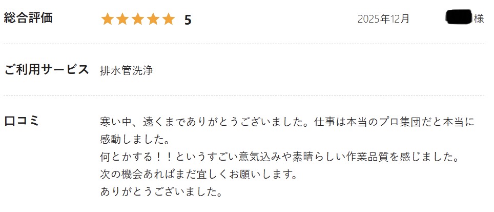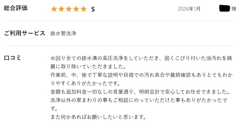 「水回り全ての排水溝の高圧洗浄をしていただき、固くこびり付いた油汚れを綺麗に取り除いていただきました。