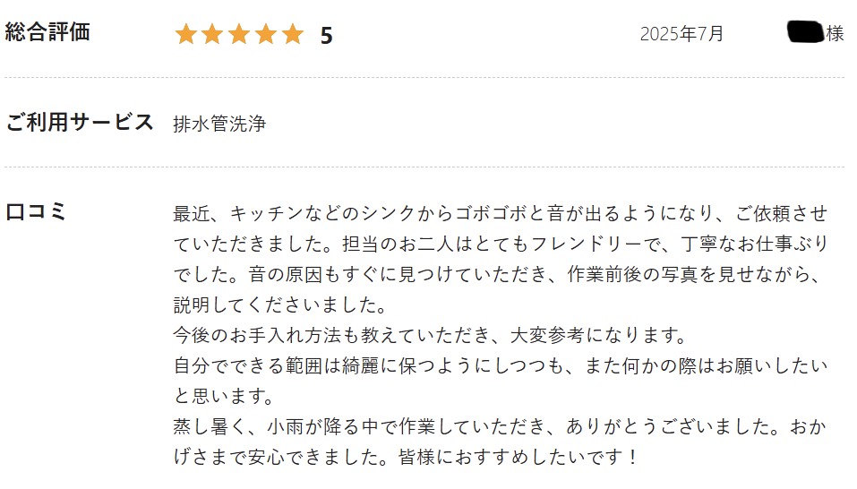 「最近、キッチンなどのシンクからゴボゴボと音が出るようになり、ご依頼させていただきました。